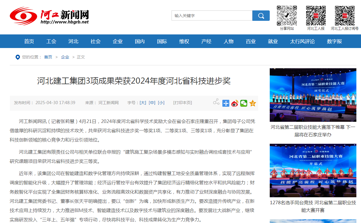 河北建工集團(tuán)3項(xiàng)成果榮獲2024年度河北省科技進(jìn)步獎 4月21日,2024年度河北省科學(xué)技術(shù)獎勵(lì)大會在省會石家莊隆重召開,集團(tuán)母子公司憑借雄厚的科研沉淀和持續(xù)的技術(shù)攻關(guān),共榮獲河北省科技進(jìn)步獎一等獎1項(xiàng)、二等獎1項(xiàng)、三等獎1項(xiàng),充分彰顯了...