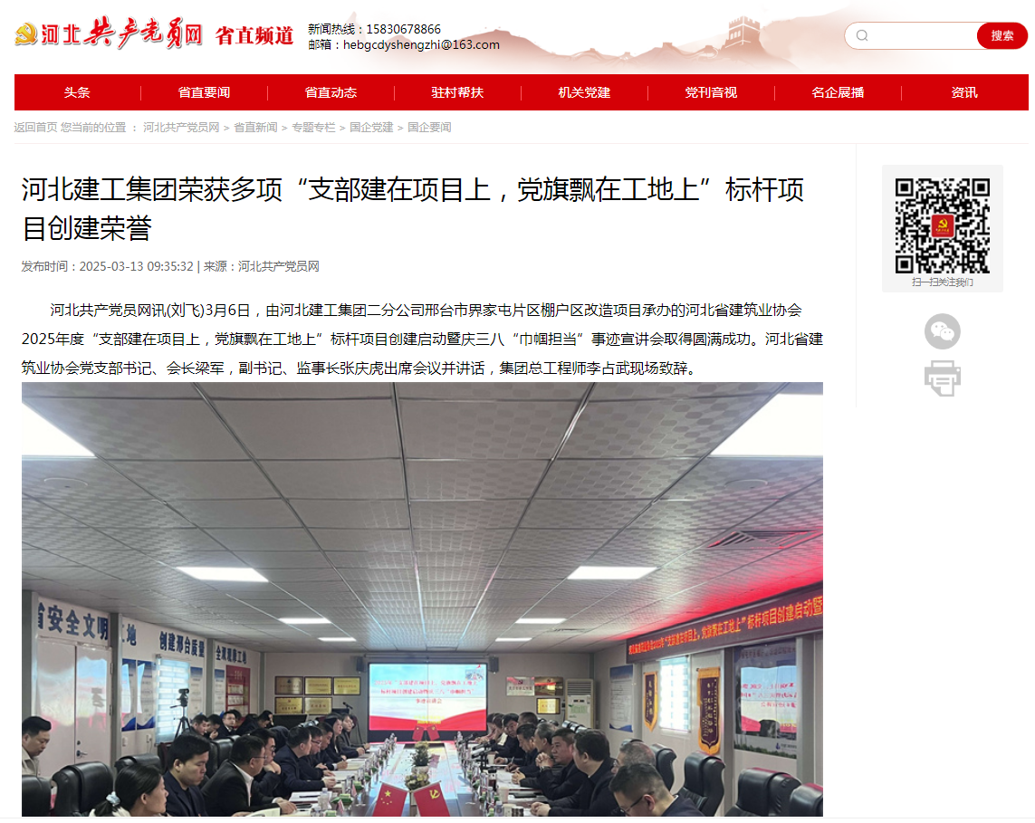 河北建工集團(tuán)榮獲多項(xiàng)“支部建在項(xiàng)目上,黨旗飄在工地上”標(biāo)桿項(xiàng)目創(chuàng)建榮譽(yù) ? ? ? 3月6日,由河北建工集團(tuán)二分公司邢臺市界家屯片區(qū)棚戶區(qū)改造項(xiàng)目承辦的河北省建筑業(yè)協(xié)會2025年度“支部建在項(xiàng)目上,黨旗飄在工地上”標(biāo)桿項(xiàng)目創(chuàng)建啟動暨慶三...